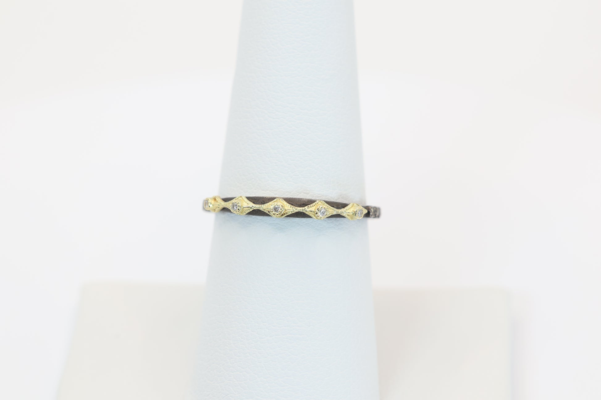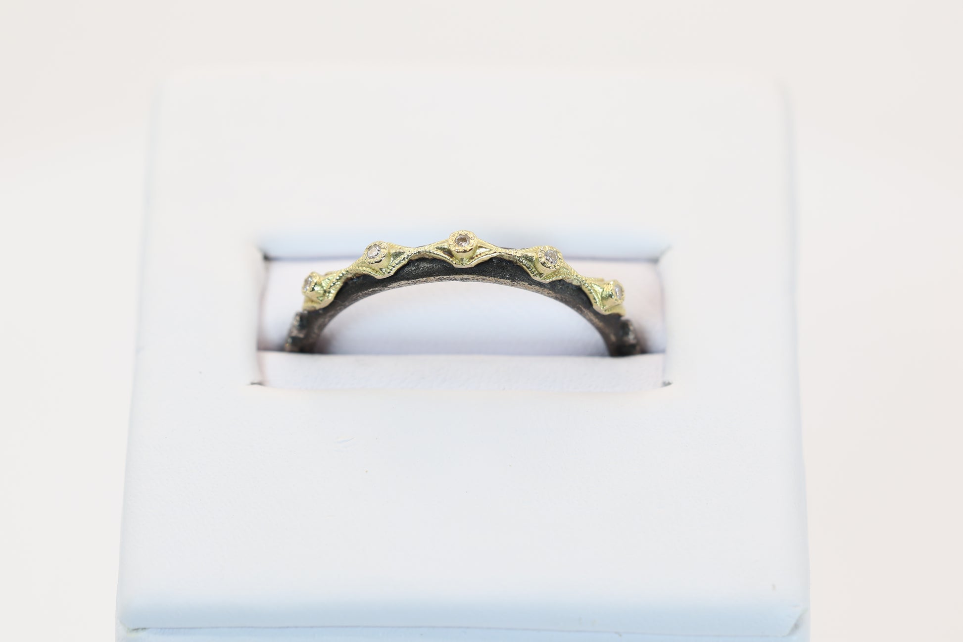 Elevate your elegance with our 18K Yellow Gold and Blackened Sterling Silver Multi-Crivelli Stack Band, adorned with a captivating arrangement of white and champagne diamonds totaling 0.18 carats. The fusion of luxurious gold, darkened silver, and sparkling diamonds creates a sophisticated and versatile piece. Whether worn individually or stacked, this ring is a testament to refined style, offering a perfect balance of modernity and timeless allure.
