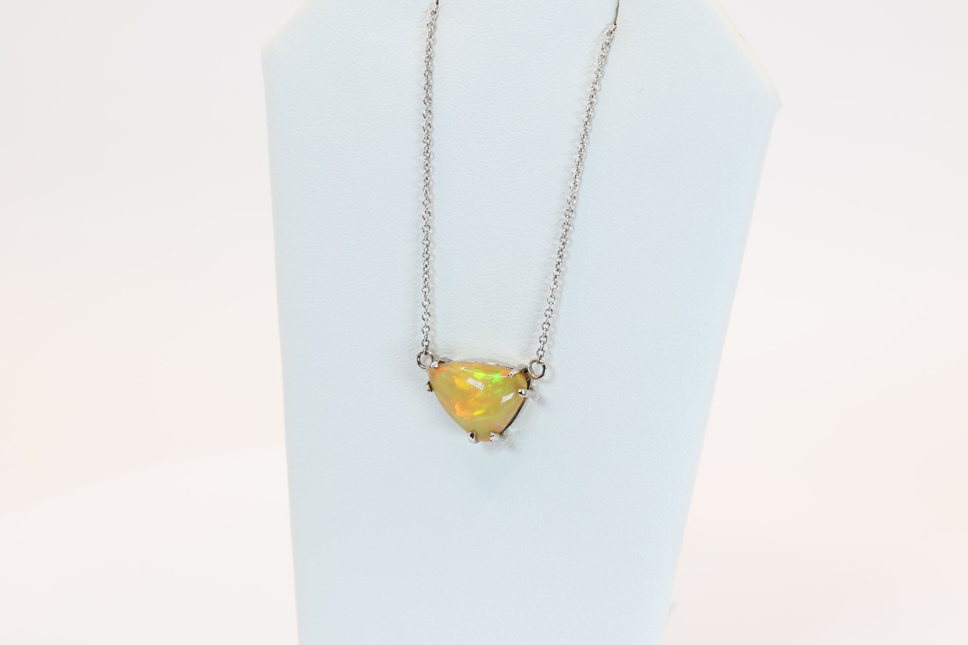 This exquisite 14k white gold necklace features a stunning bezel/prong set Ethiopian opal pendant, making it a perfect addition to any jewelry collection. The pendant is custom made and hangs on a 20.5 inch long chain set in 14kwg, making it a versatile accessory that can be worn on any occasion.