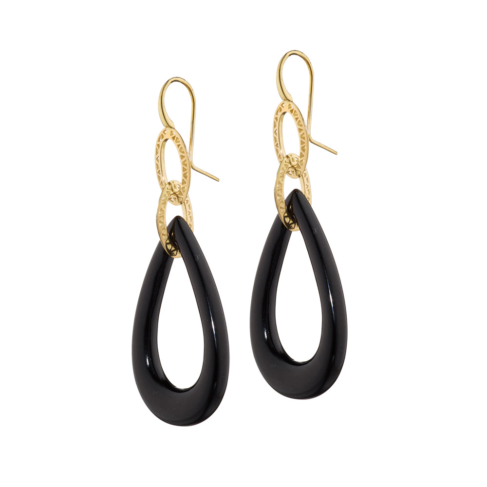 This is a beautiful pair of 18k yellow gold Crownwork link earrings with Black Onyx pear shaped drops on hooks. Made of 18k spring gold so its high tensile, easy to get on and off and helps the earring hang directly underneath the earlobe. All of the gold we use is certified eco-responsible, recycled metal. Unlike mining, where approximately 20 tons of waste is generated to produce just one ounce of gold, refining precious metals has virtually no waste and is much better for the earth.