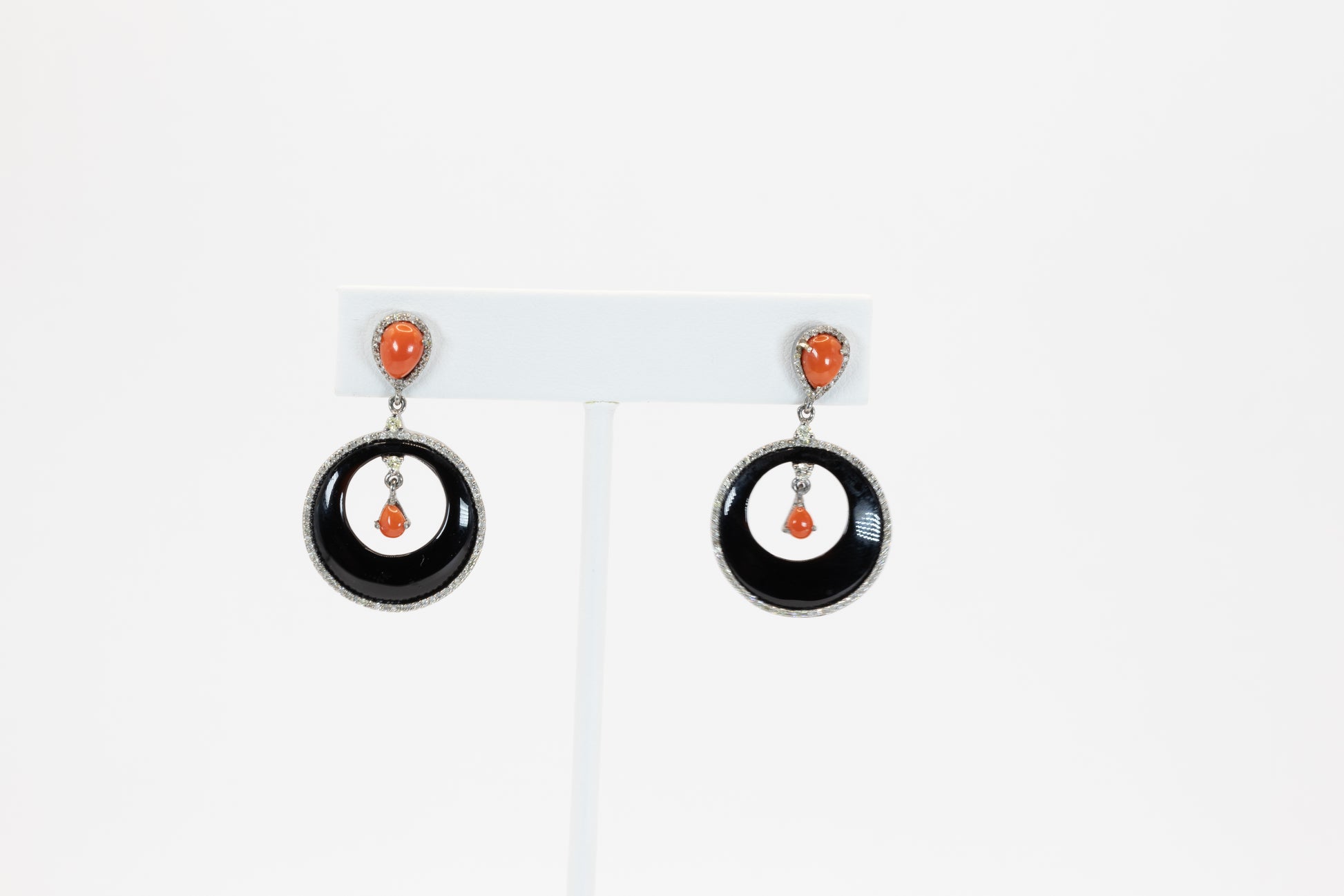 Black Onyx & Red Coral Earrings with Diamonds set in Sterling Silver