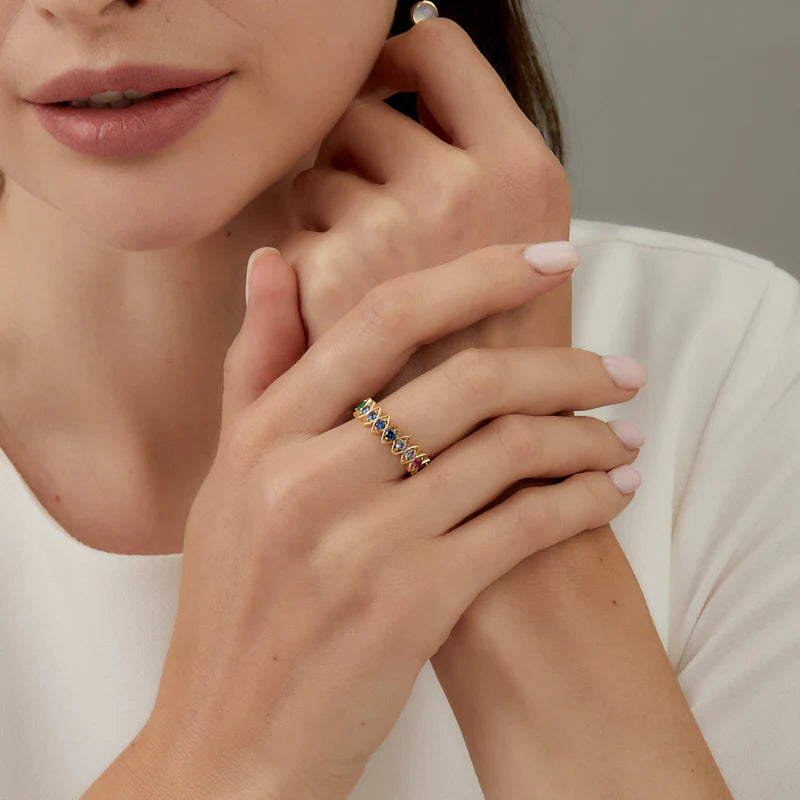 A colorful treasure from our Chakra collection, this perfect-for-everyday ring has a surprising design detail: each of the gemstone stations is actually an evil eye turned on its side. Protective and powerful while also playful, this 18K gold ring is a must-have.