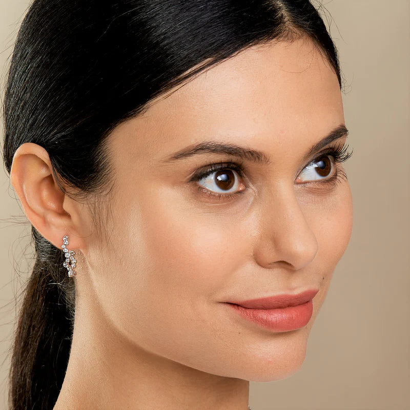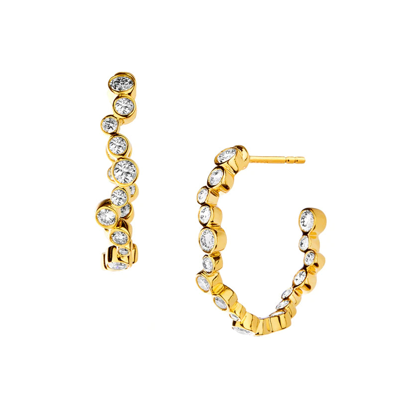 Gleaming hoops inspired by celestial themes, these post-back earrings are the perfect everyday accessory with a hint of magic. A meandering line of diamonds in varying sizes are set in elegant 18K gold bezels, which look like a belt of stars in the night sky.
