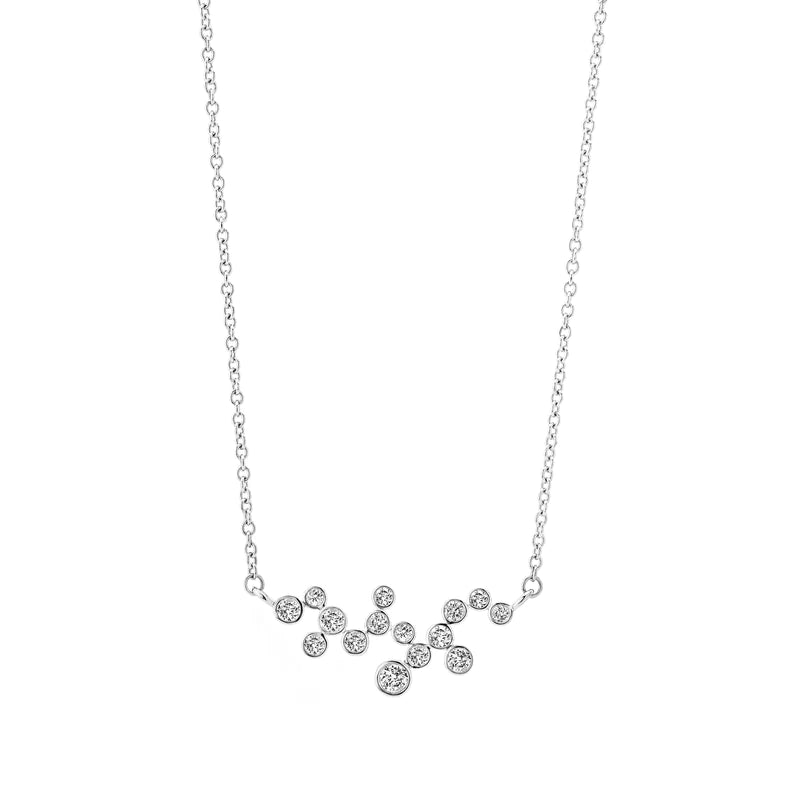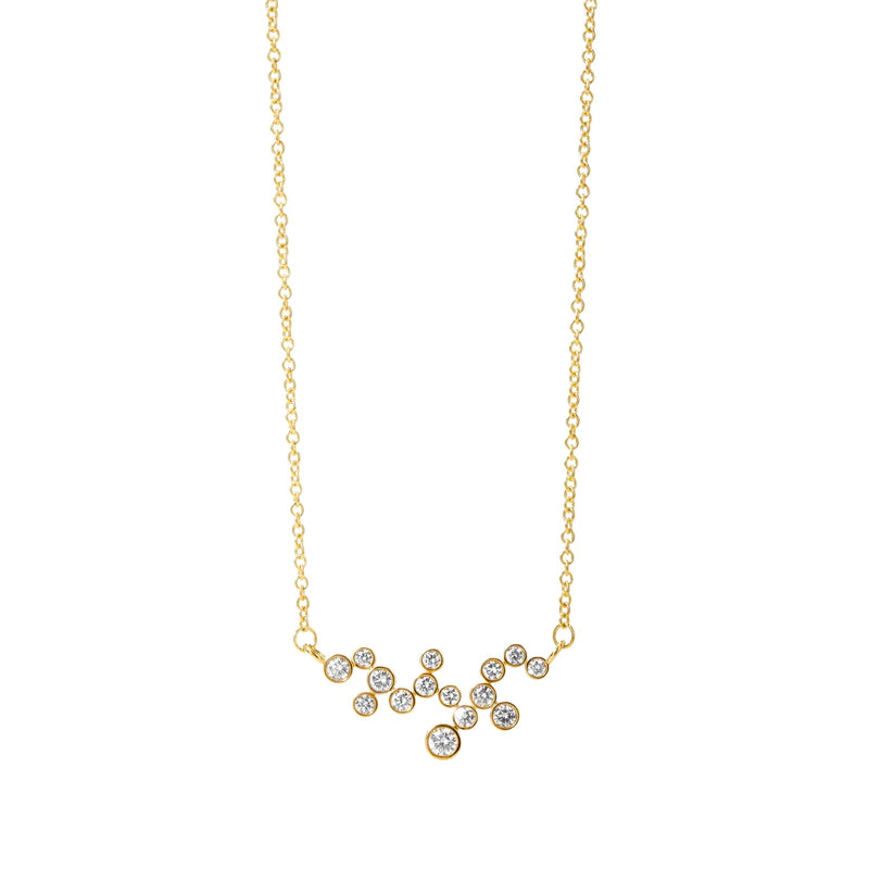 Adorn yourself with a sparkling constellation by wearing this memorable necklace, which is inspired by celestial themes. The twinking bezel-set diamonds in various sizes are complemented by the enduring warmth of 18K gold.