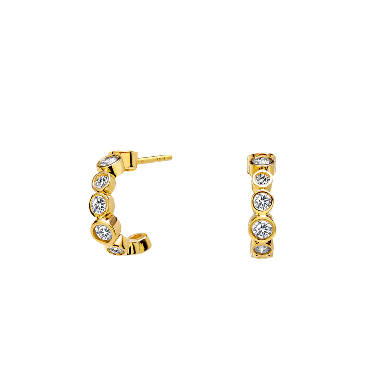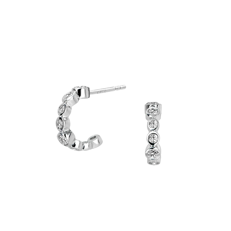 Dazzling mini hoops inspired by celestial themes, these post-back earrings are the perfect everyday accessory with a hint of magic. A line of diamonds in varying sizes are set in elegant 18K gold bezels, which look like a belt of stars in the night sky.