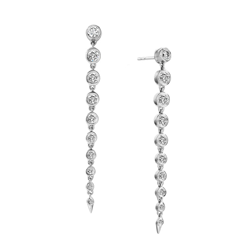 A celestial take on the classic diamond line earring silhouette, these Shooting Star earrings from our Cosmic collection resemble a trail of stardust, perfect for adding elegance and sparkle to your look. Sparkling diamonds are bezel set in 18K gold.
