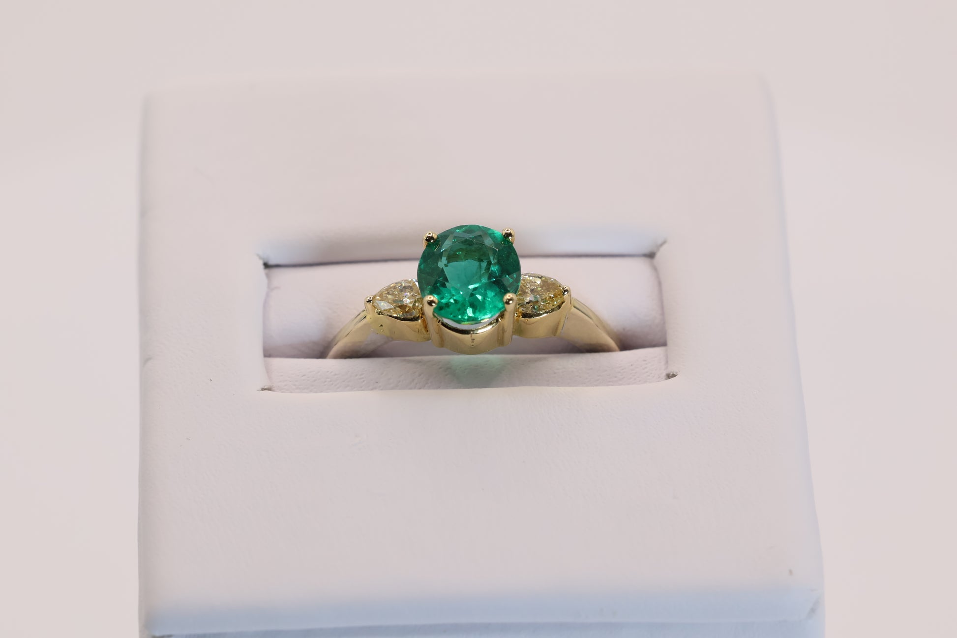 Take a look at this breathtaking two-tone emerald and diamond ring. Featuring a stunning 0.90cts oval emerald as its centerpiece, flanked by two pear-shaped yellow diamonds totaling approximately 0.20cts. Set in a harmonious blend of white and yellow gold, this timeless ring will always be in style.