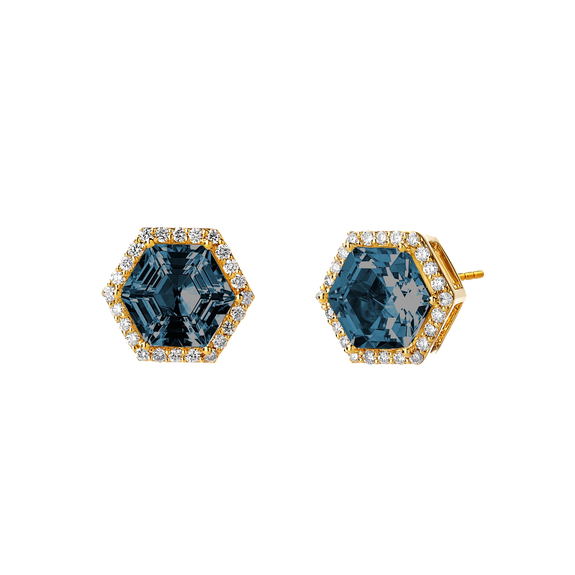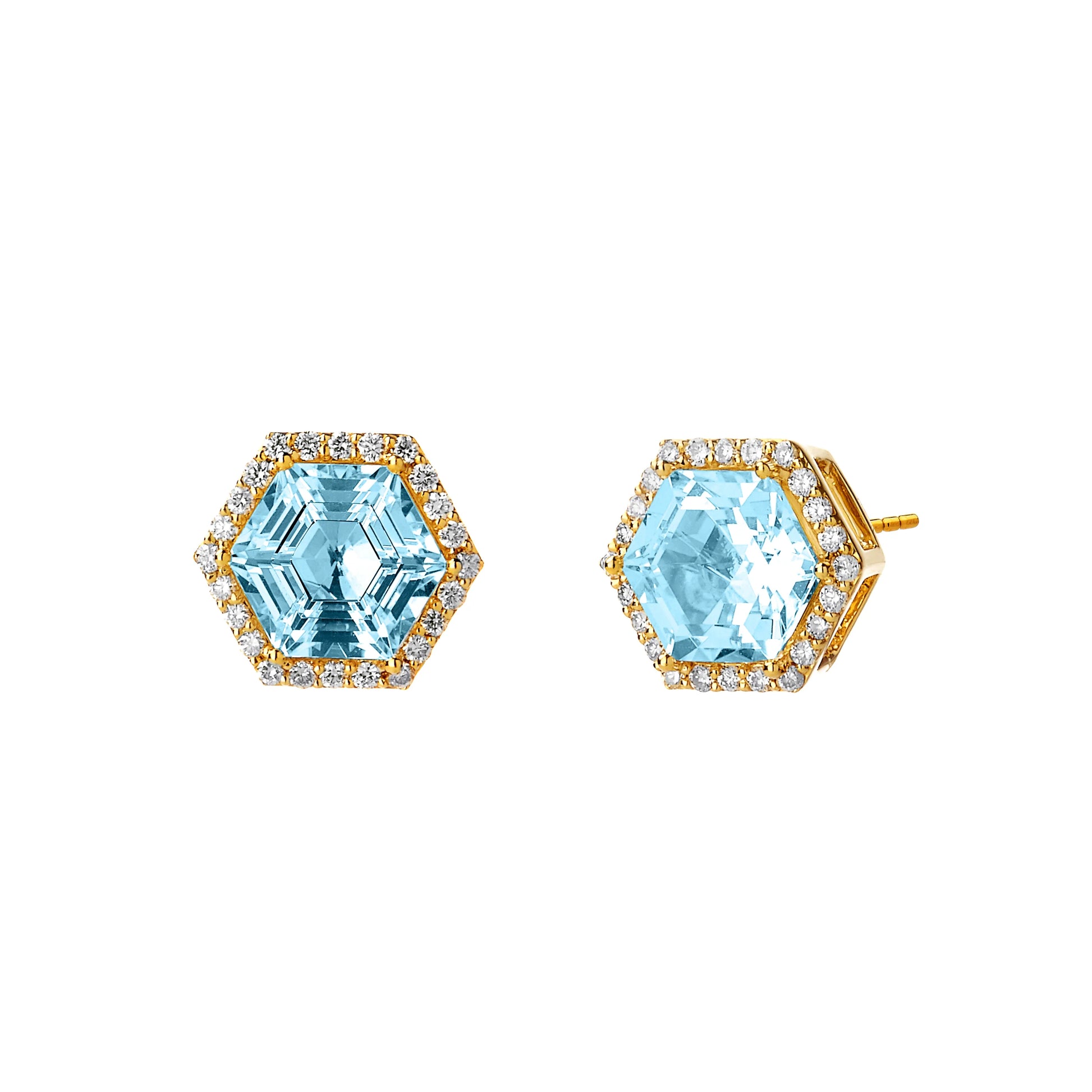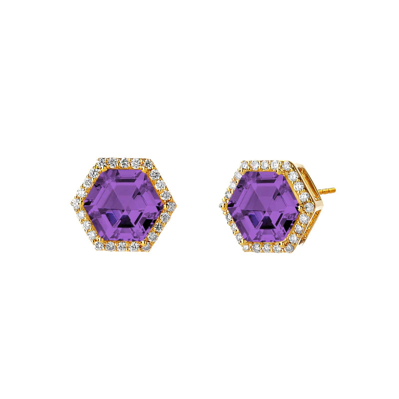 A stud that's just as appropriate for everyday wear as it is for special occasions, our Hex Studs feature your choice of gemstone for a sparkling statement. With 18K yellow gold settings and hexagonal halos of diamonds, these classic earrings are made to last.