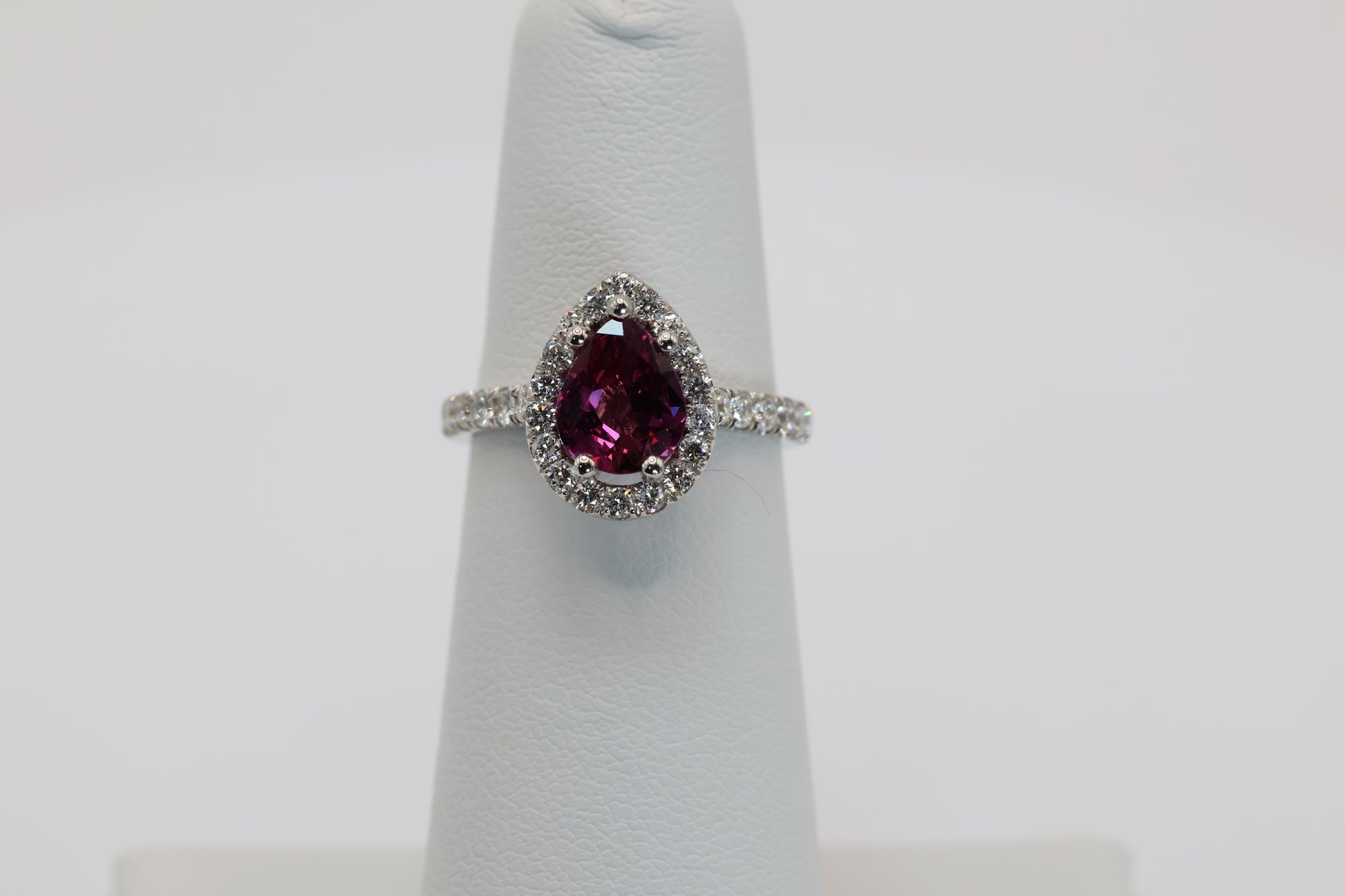 Lrg Pear Shaped Ruby Ring 14k wg with diamonds