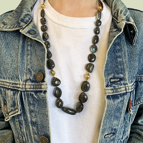 This is a beautiful labradorite necklace with two medium Crownwork® finials and two amphoras on oxidized silver chain and lilypad clasp. Oxidized silver has a beautiful historic feel for jewelry ( think Austro-Hungarian empire ) and is a wonderful contrast to gold so for necklaces it looks rich and strong. When its oxidized really polished black, the stone pops with rich saturated color and look luxurious. The design inspiration for the finials are the Moores in Spain. It’s my translation of the columns in the Alluhumbra Palace. The design is a very old world form that fits jewelry perfectly and I use it in many configurations throughout the collection. The lilypad clasp is a way for me to finish a piece of jewelry with a personal design touch. The clasp is very safe and easy to open and close. Its something that shows the true nature of the piece being made by hand not manufactured.