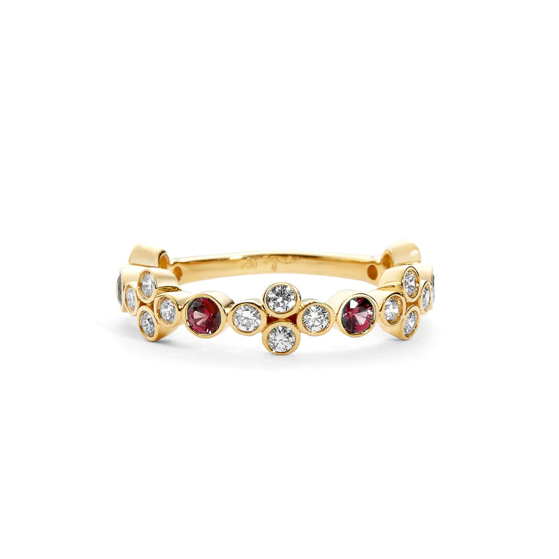 Inspired by motifs in ancient Mughal ornamentation, this essential ring is lovely as a stacking band or even as a wedding ring. Crafted in 18K yellow gold, it features clusters of twinkling diamonds interspersed with your choice of gemstone, all bezel set.