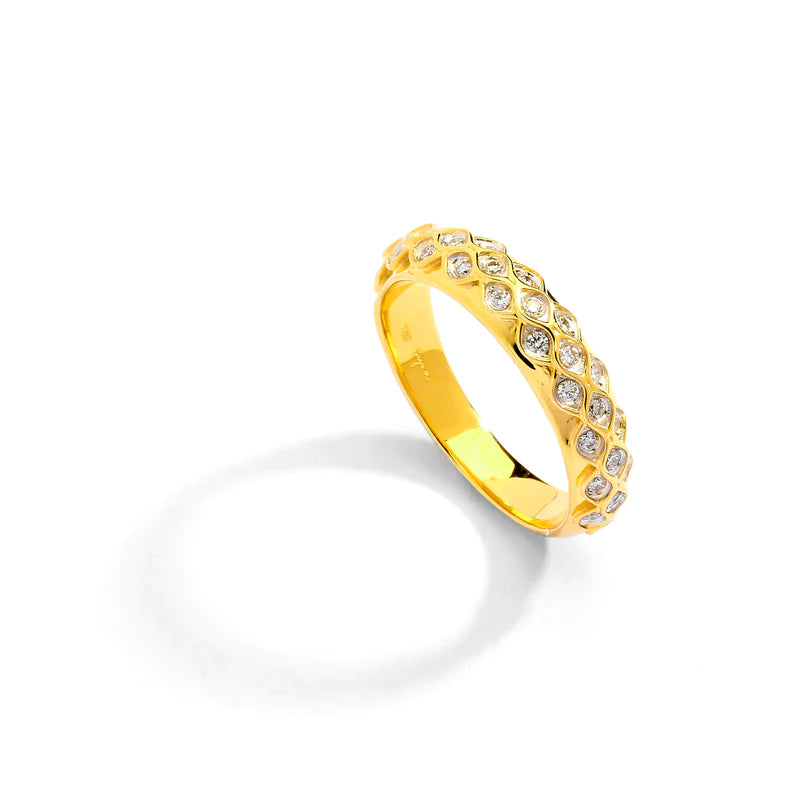 The pleasing texture and design on this essential diamond band ring is inspired by ancient Mughal ornamentation. Sparkling diamonds are nestled in the 18K yellow gold "pockets" for dimension and refinement.
