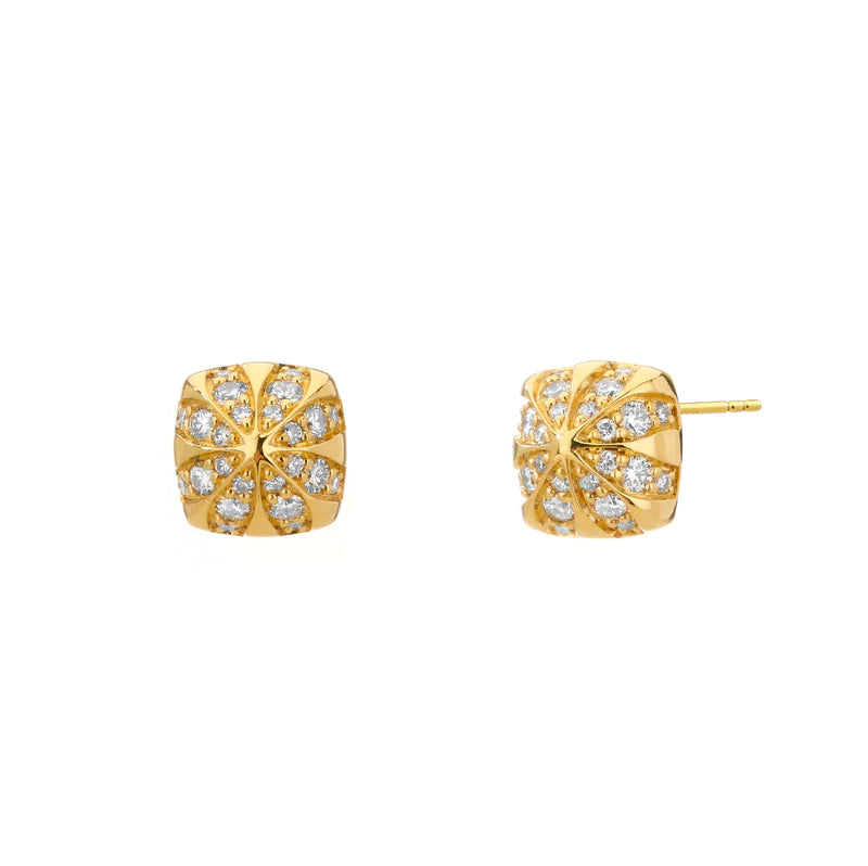 The sculptural sugarloaf shape usually reserved for cabochon gemstone cuts is reinterpreted in 18K yellow gold in these sophisticated, everyday stud earrings. diamonds in various sizes add sparkle and dimension to the must-have studs.