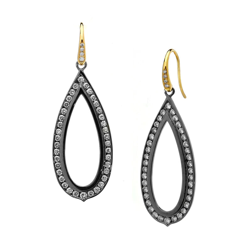 The tear-drop silhouette is both elegant and flattering, perfect for any face shape or occasion. Featuring an oxidized-silver body and 18K yellow-gold ear wires, these tear-drop earrings are modern but offer a hint of vintage flair for a conversation-starting finish.