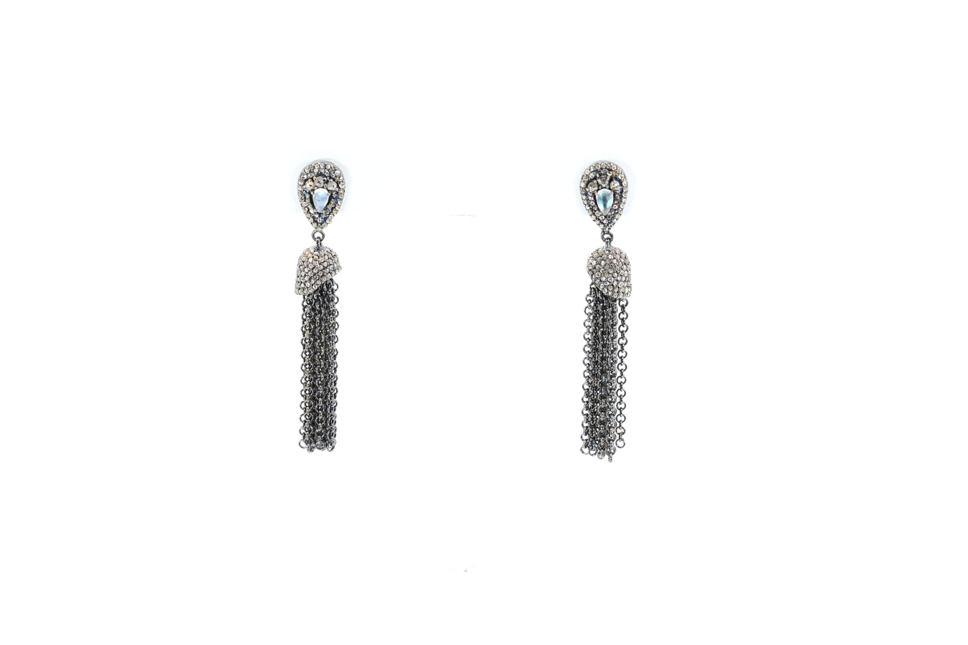Oxidized Silver Chain Earrings with Diamonds and Moonstone