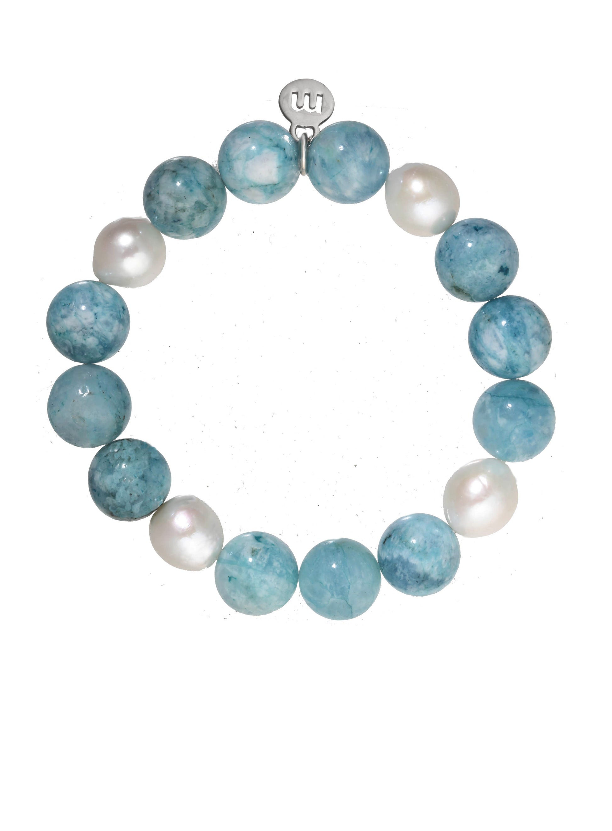 Smooth amazonite ball, small white baroque pearl, 7.5” stretch