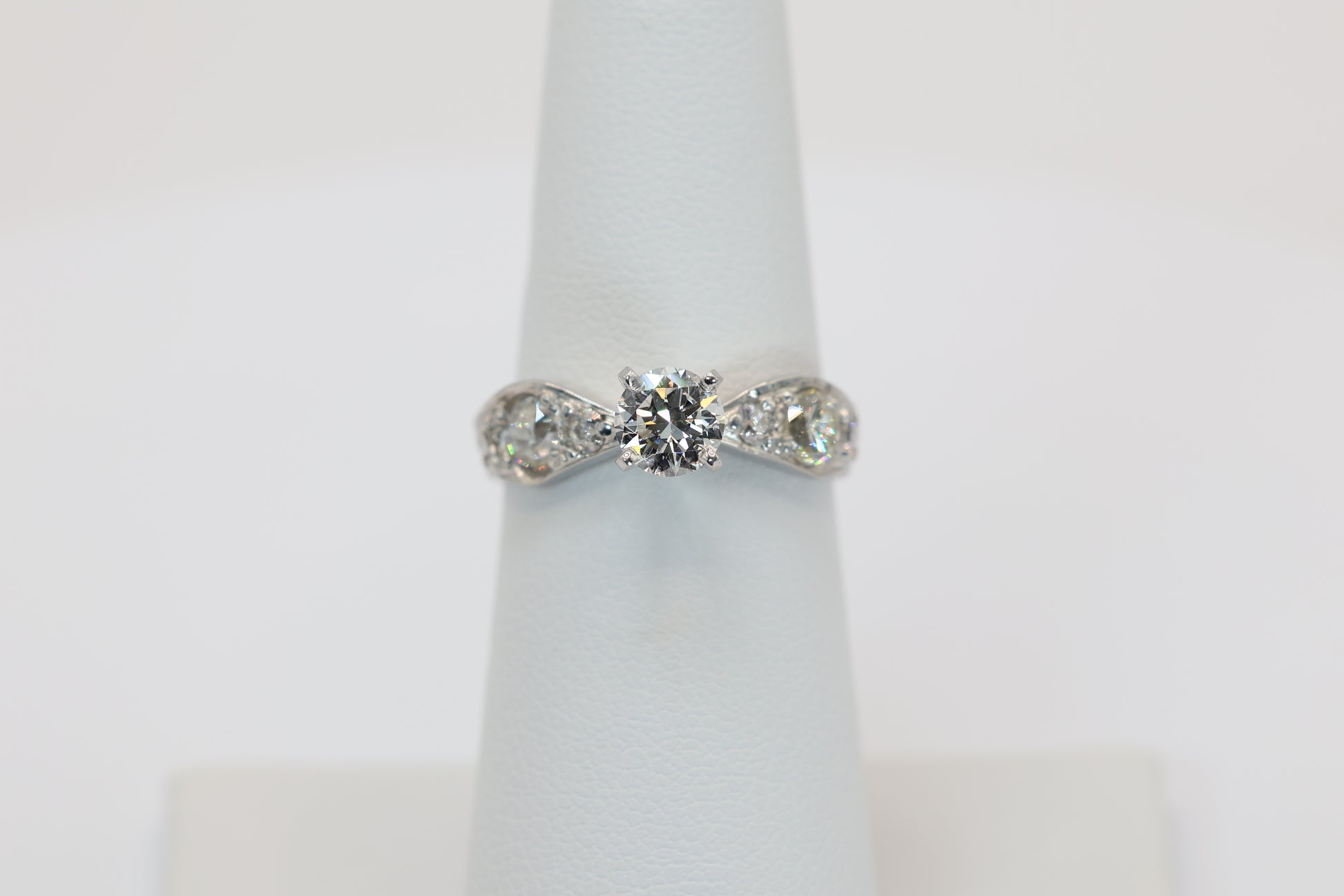 This vintage platinum engagement ring boasts a beautiful natural round diamond as its main stone that is approximately .35 cts and approximately VS2-SI1 clarity, and H/I color. It has nice sized secondary stones that add amazing sparkle! The roughly .85 tcw of diamonds are set in a stunning high-purity 950 platinum band. The ring is size 5.75.